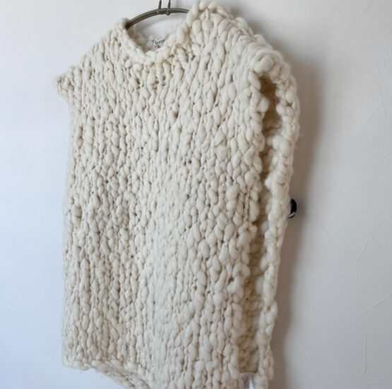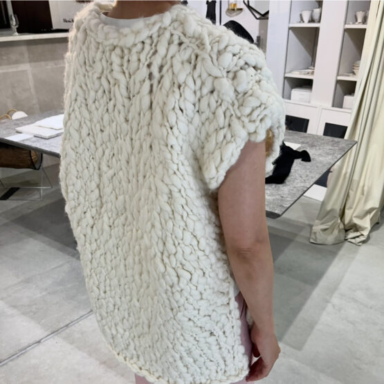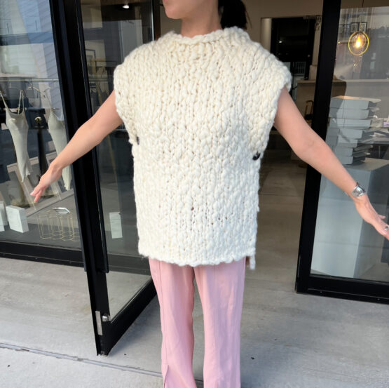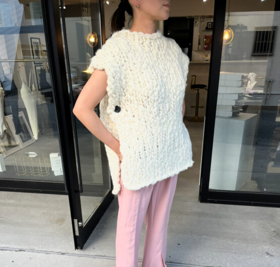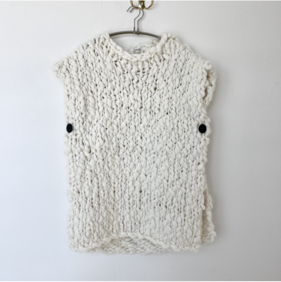 極太のロービングスラブヤーンを、一本一本の表情を確かめながら丁寧に手編みしたスリーブレスニット。