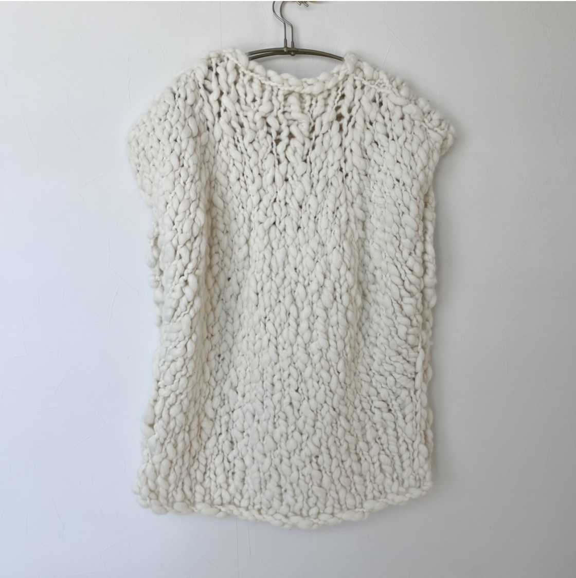 極太のロービングスラブヤーンを、一本一本の表情を確かめながら丁寧に手編みしたスリーブレスニット。